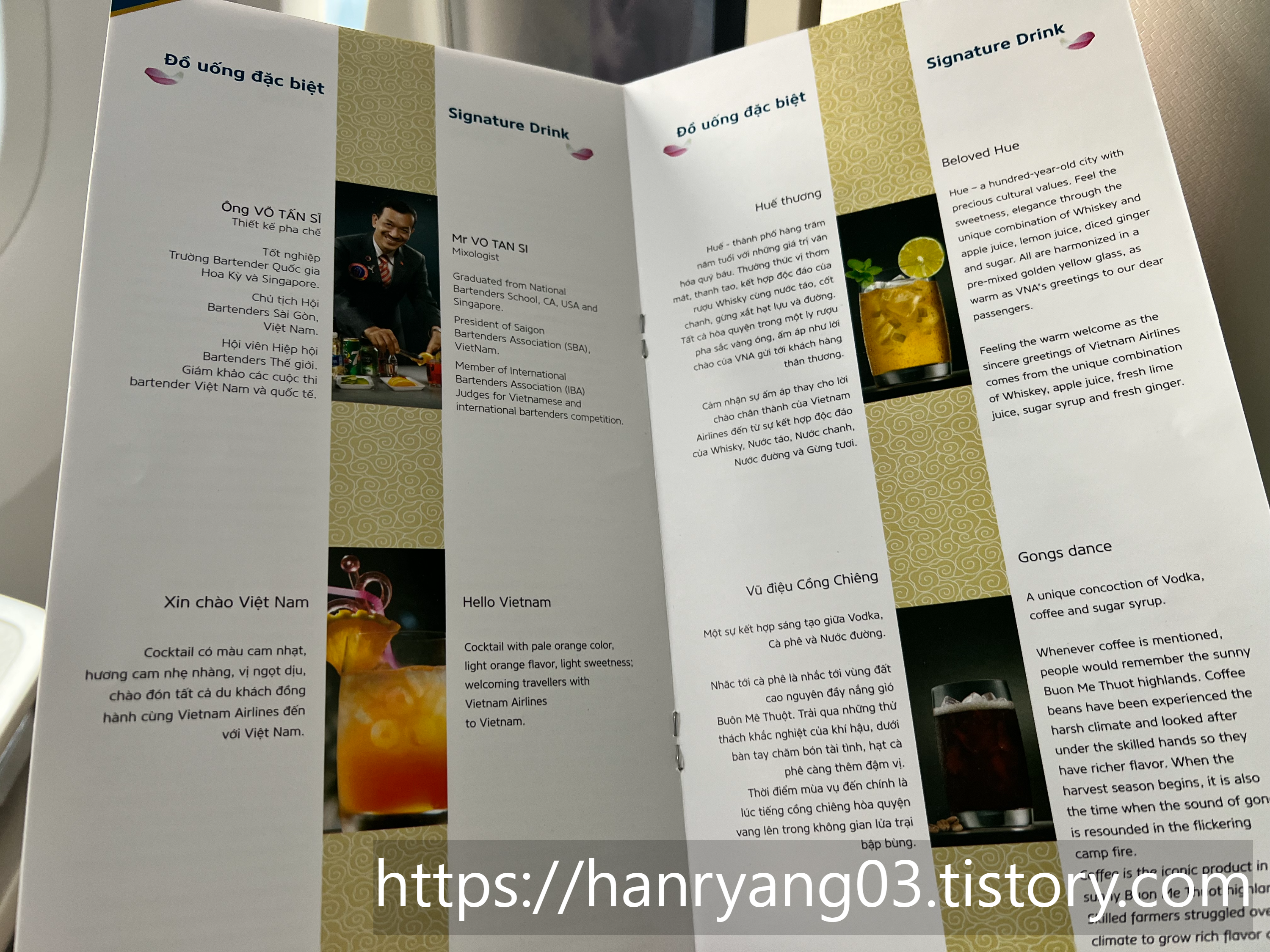A359와 B789 기재에서만 이용 가능한 기내 바 메뉴판이다. 주문을 받는 승무원 분의 추천으로 Hello Vietnam 칵테일까지 같이 주문했다. 승무원 말로는 베트남 항공의 시그니처 칵테일이라고 한다.