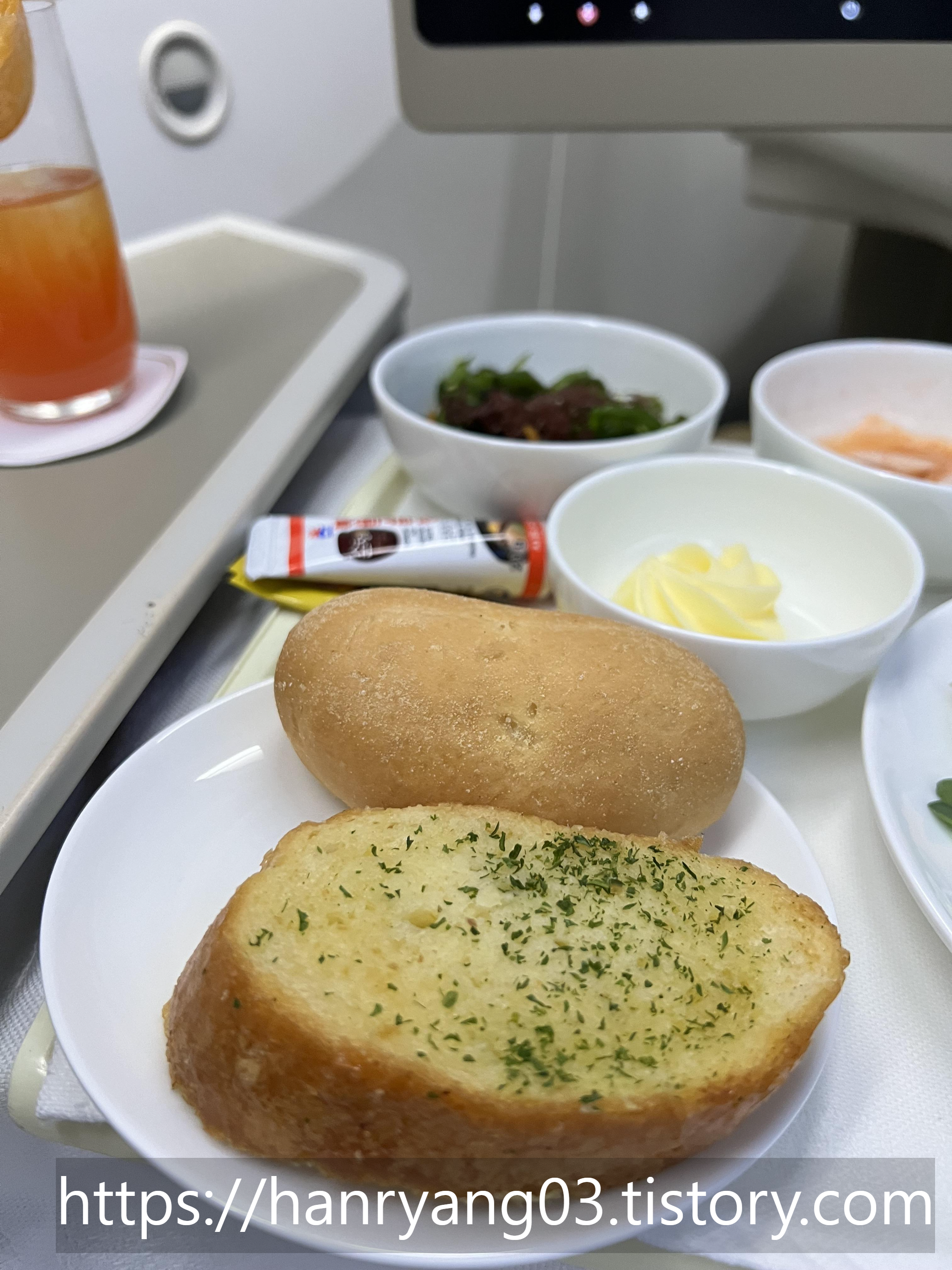 마늘빵과 빵이다. 빠다는 대한항공처럼 가염빠다가 아니라 그냥 평범한 맛이었지만, 빵은 상당히 맛있었다. 위에 있는 빵은 기대 이상으로 부드러웠다.