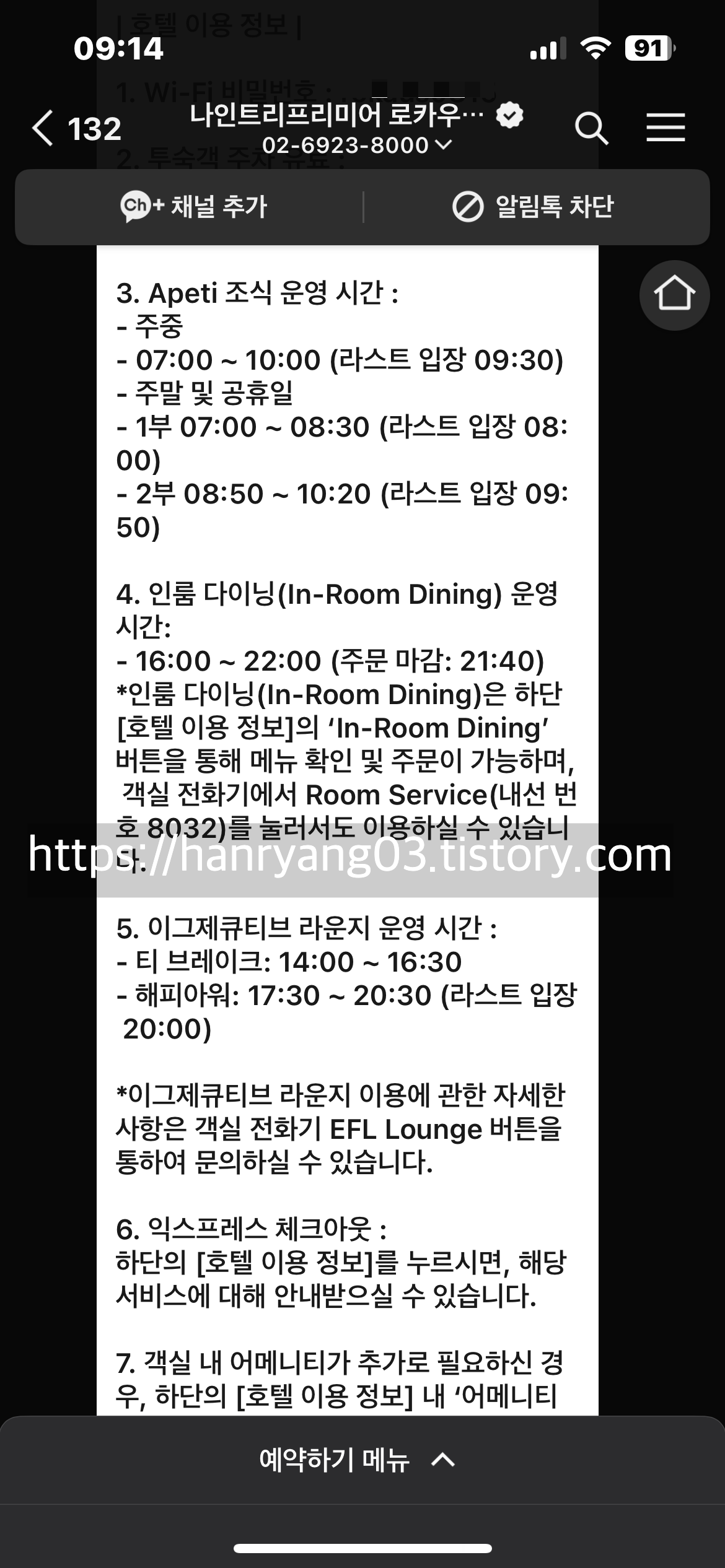 체크인 할 때 보내주는 안내톡에 룸서비스 주문 링크가 있고, 거기서 주문을 할 수 있다. 주문을 하고 나면 식음업장에서 전화가 오고, 거기에서 얼마나 걸릴지, 결제는 어떻게 진행할 지 안내를 해준다. 다른 호텔과 동일하게 체크아웃 할 때 결제할 수도 있고, 신기하게 룸서비스를 받자마자 바로 결제를 할 수도 있었다.