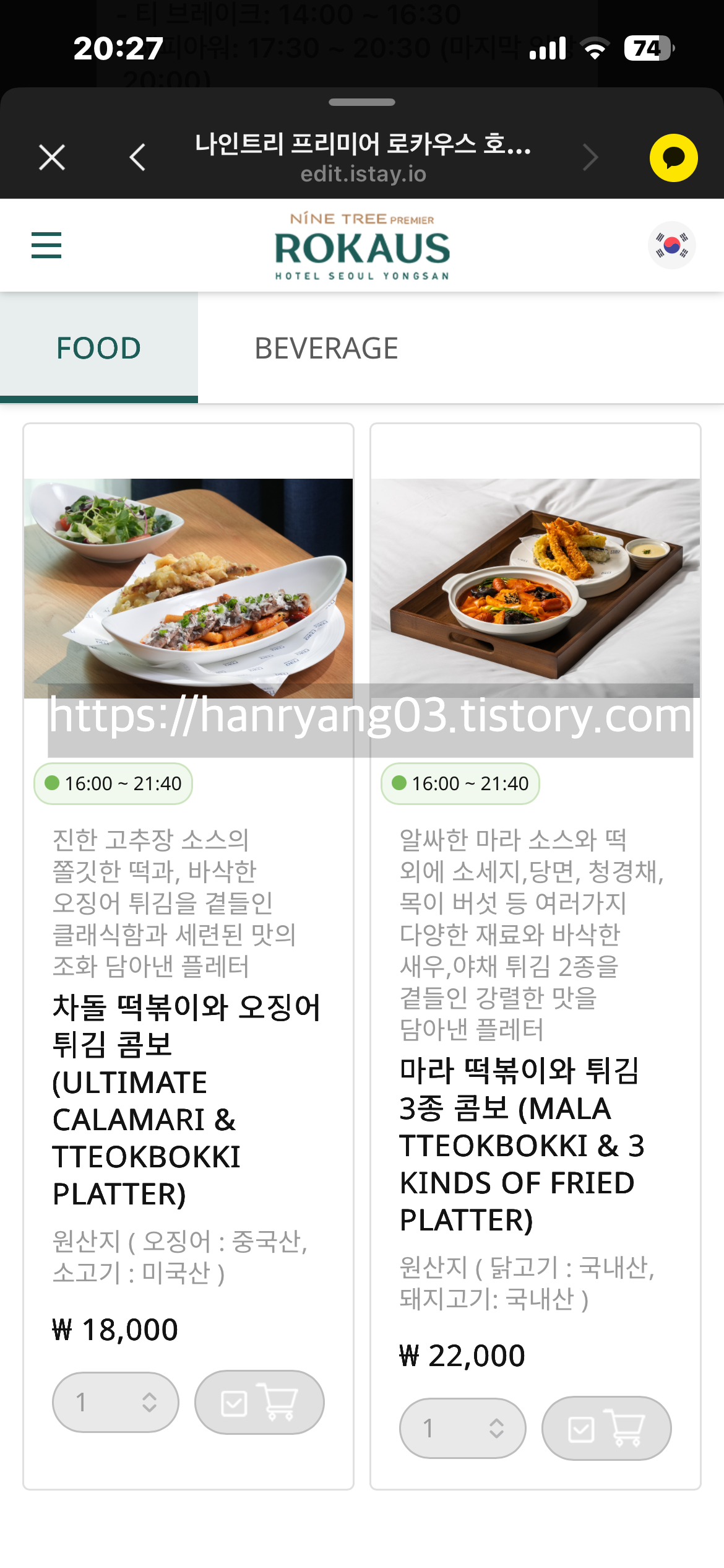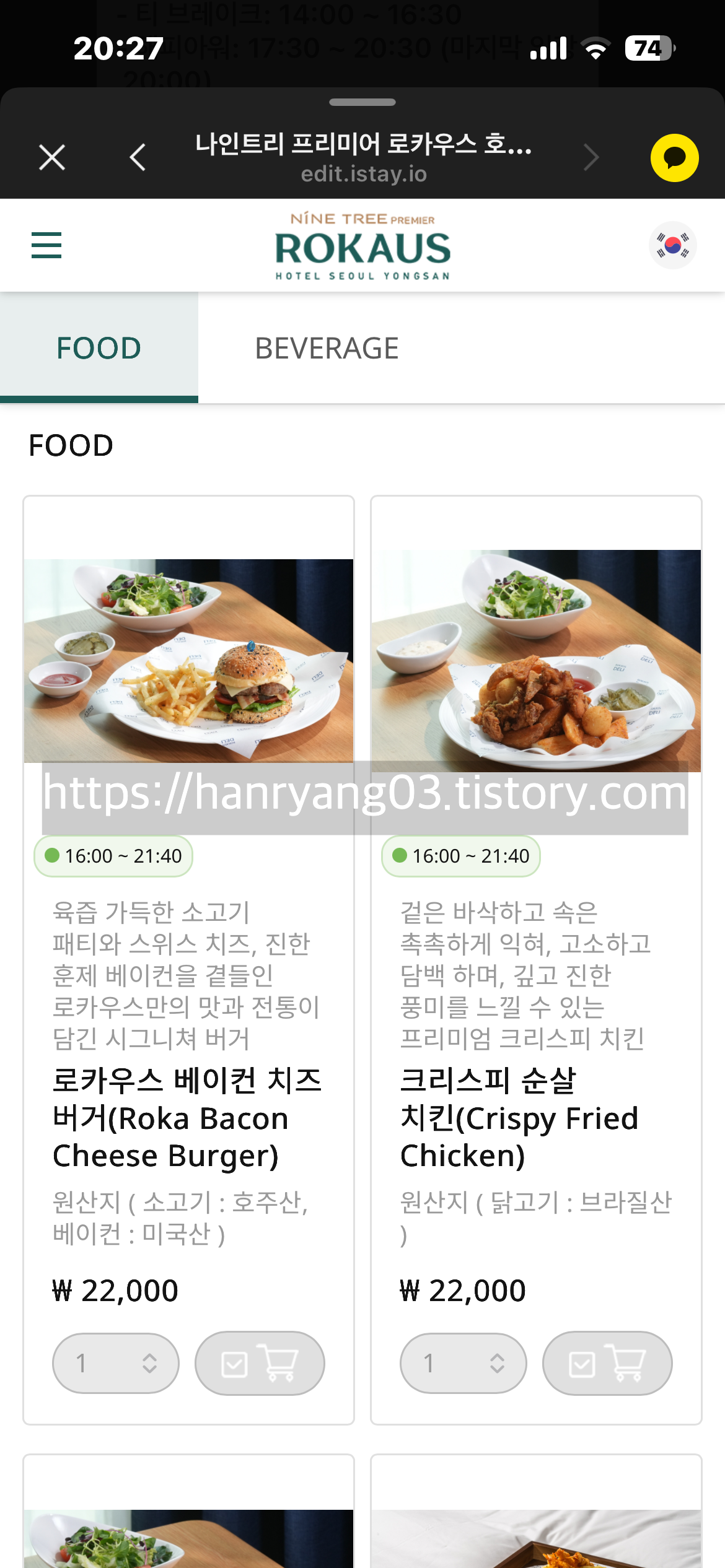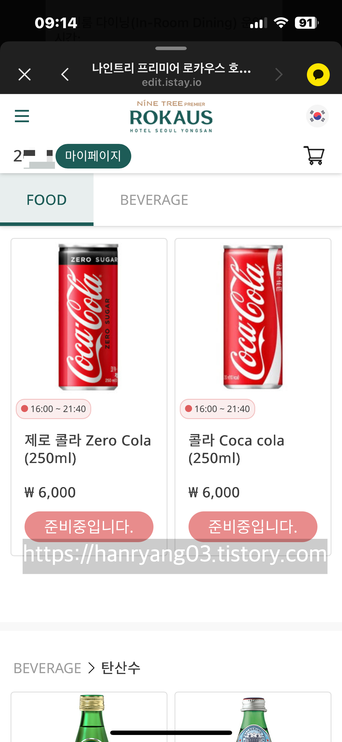 이 당시에 캡쳐해둔 메뉴와 룸서비스 이용 당시 메뉴가 달랐다.