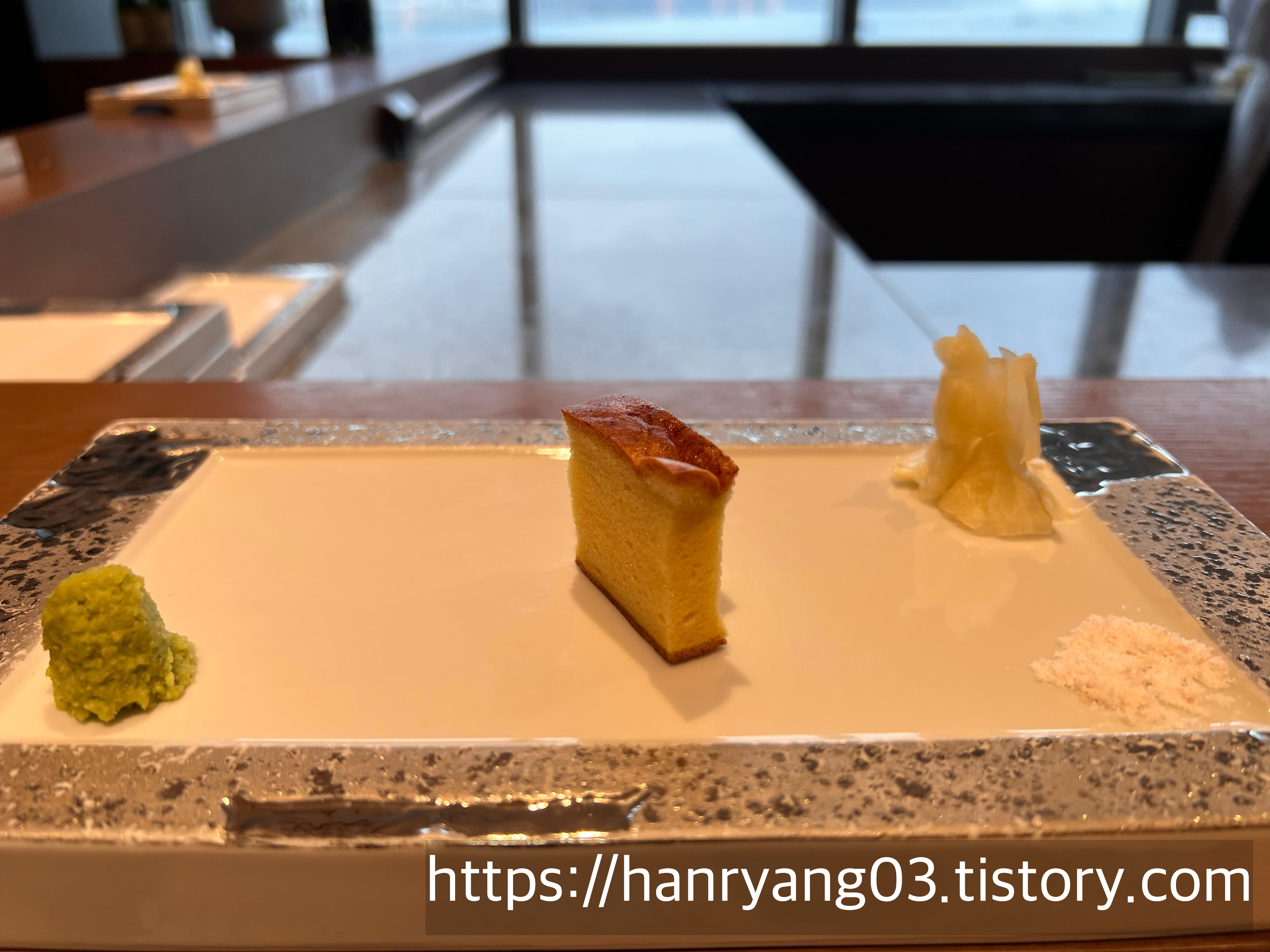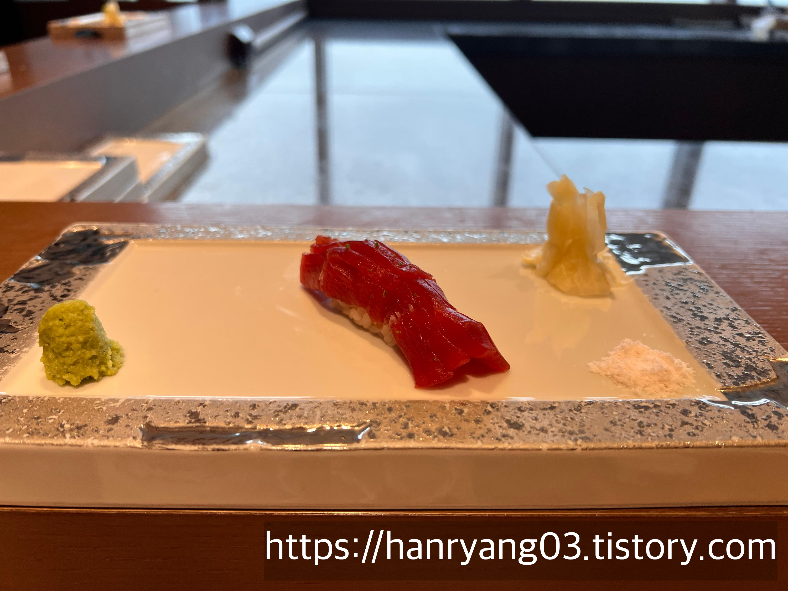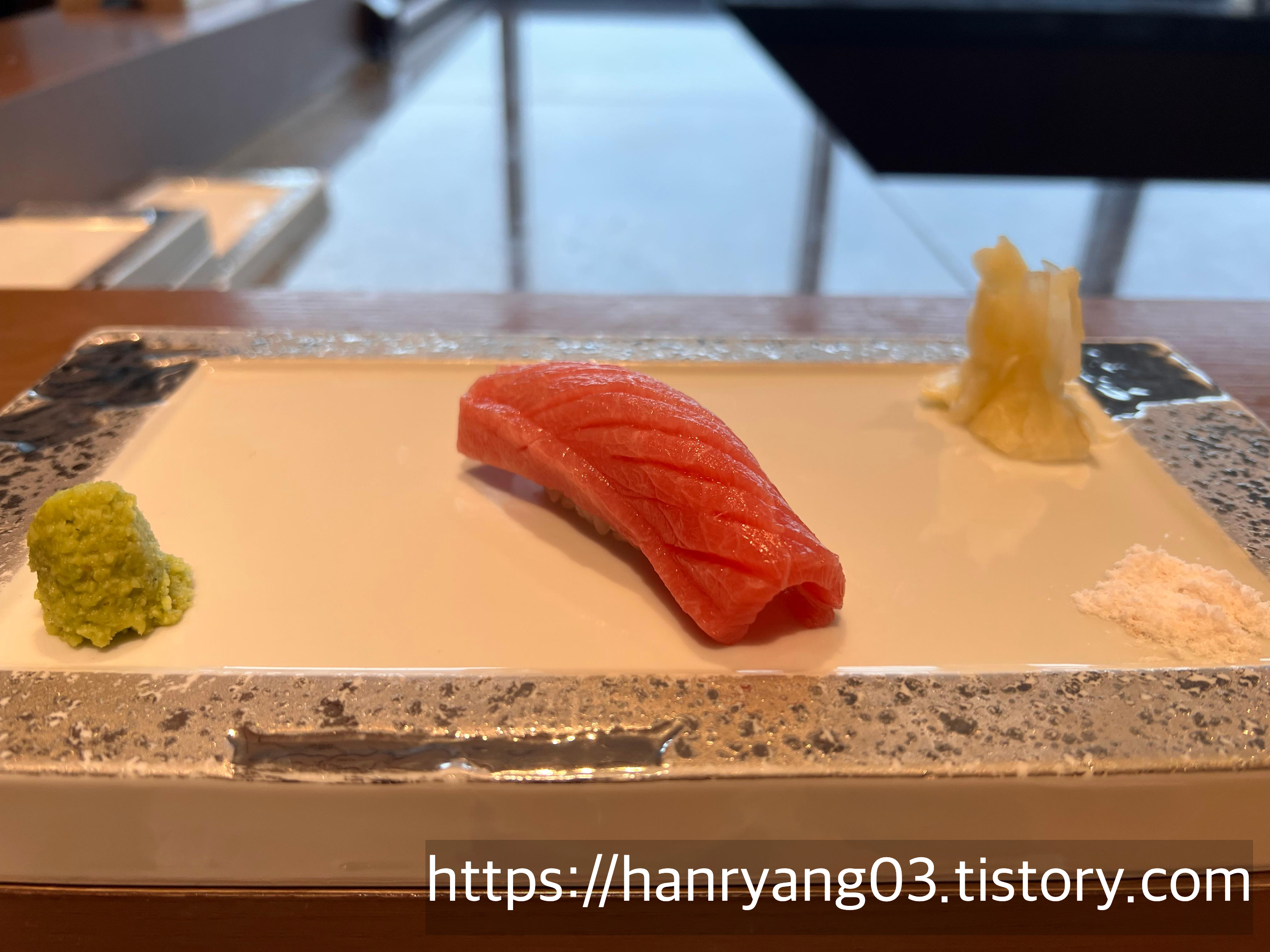 총 두 점이 나오는데, 하나는 소금에, 하나는 게우소스에 찍어먹으면 된다. 게우소스가 빠다맛이 상당히 잘 느껴지고, 달짝찌근하면서 감칠맛이 돋아 상당히 인상깊었다. 샤리를 달라고 해서 남은 소스와 비벼먹으려다가, 그러기에는 뭔가 소스의 양이 부족해 그냥 그릇째로 들고 핥아먹었다.