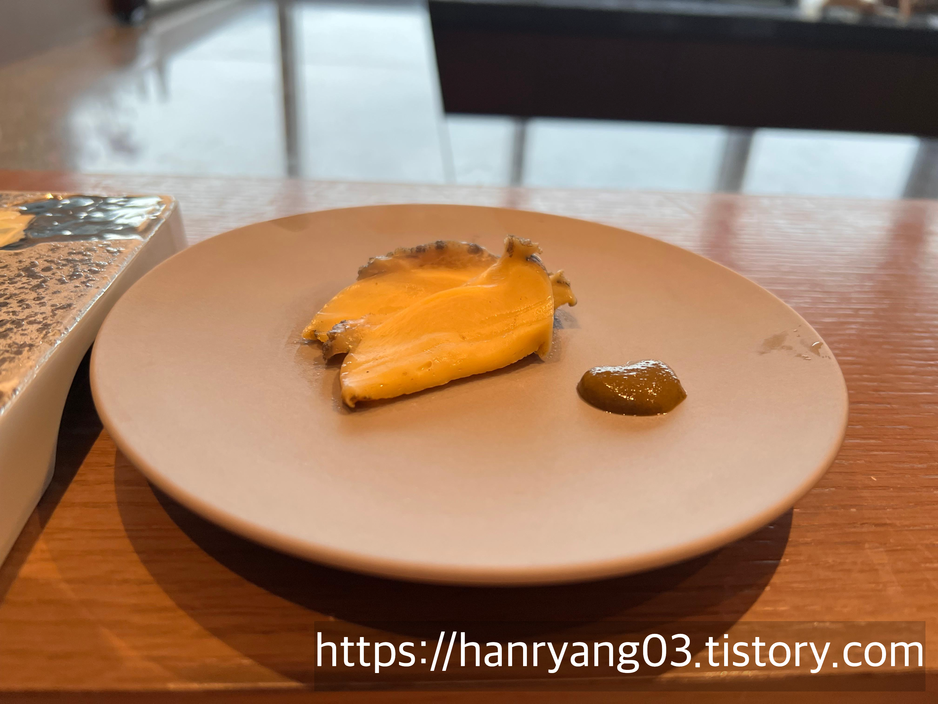 간장에 절였고, 제주산 청귤 껍질을 갈아서 올려줬다. 참치 위에 청귤을 뿌리는건 상상도 못했는데, 청귤의 상큼한 맛이 생각보다 잘 어울려서 놀랐다.