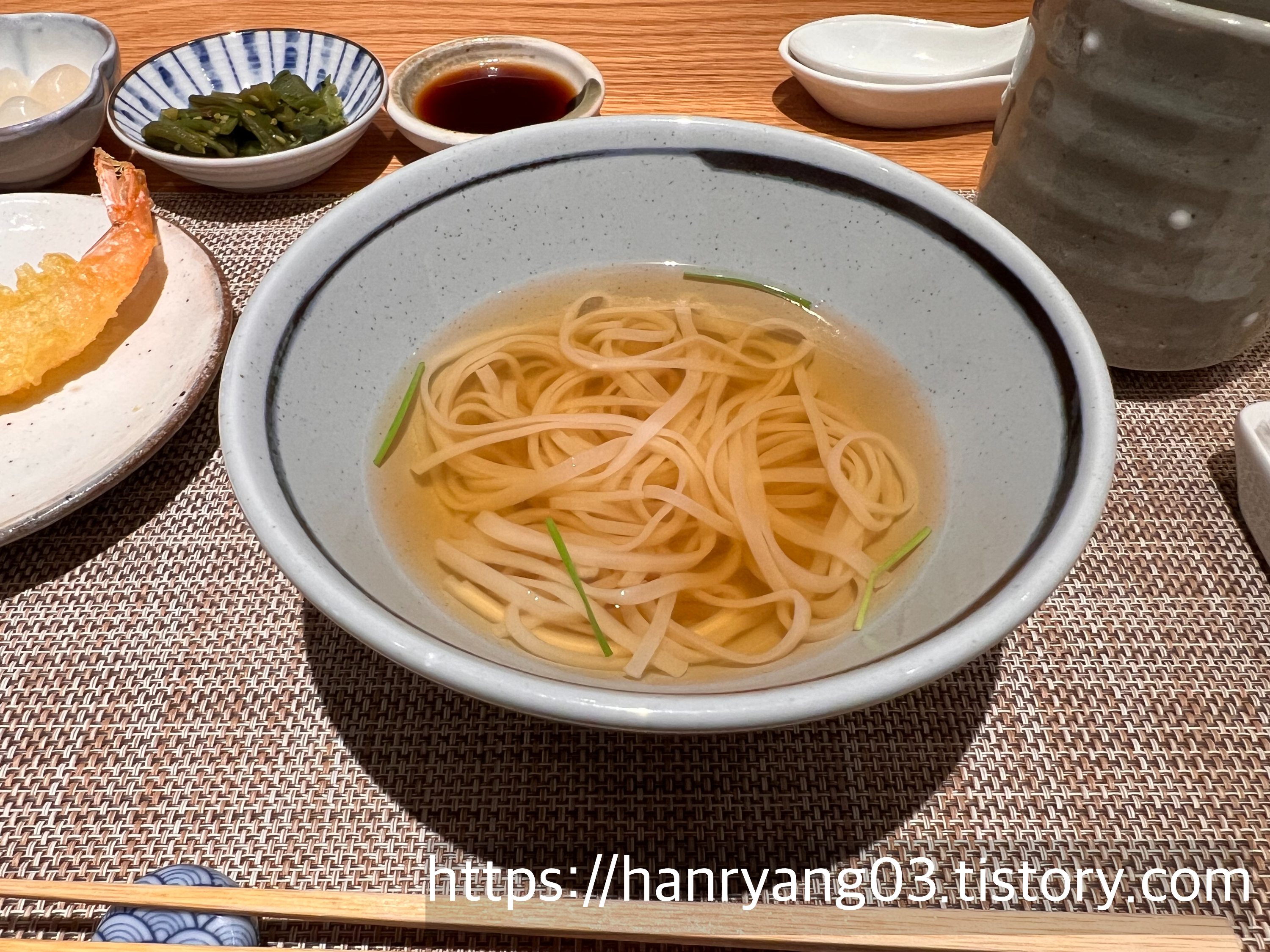 상당히 잘 튀겨져서 바삭바삭하면서도 단맛이 돌았다. 간장에 찍어서 생으로 먹어도 되고, 뒤에 나오는 우동에 담궈서 튀김우동 느낌으로 먹어도 좋다. 필자는 반은 간장에 찍어서 한 입에 먹어버리고, 나머지 반은 우동에 담궈서 먹었다.