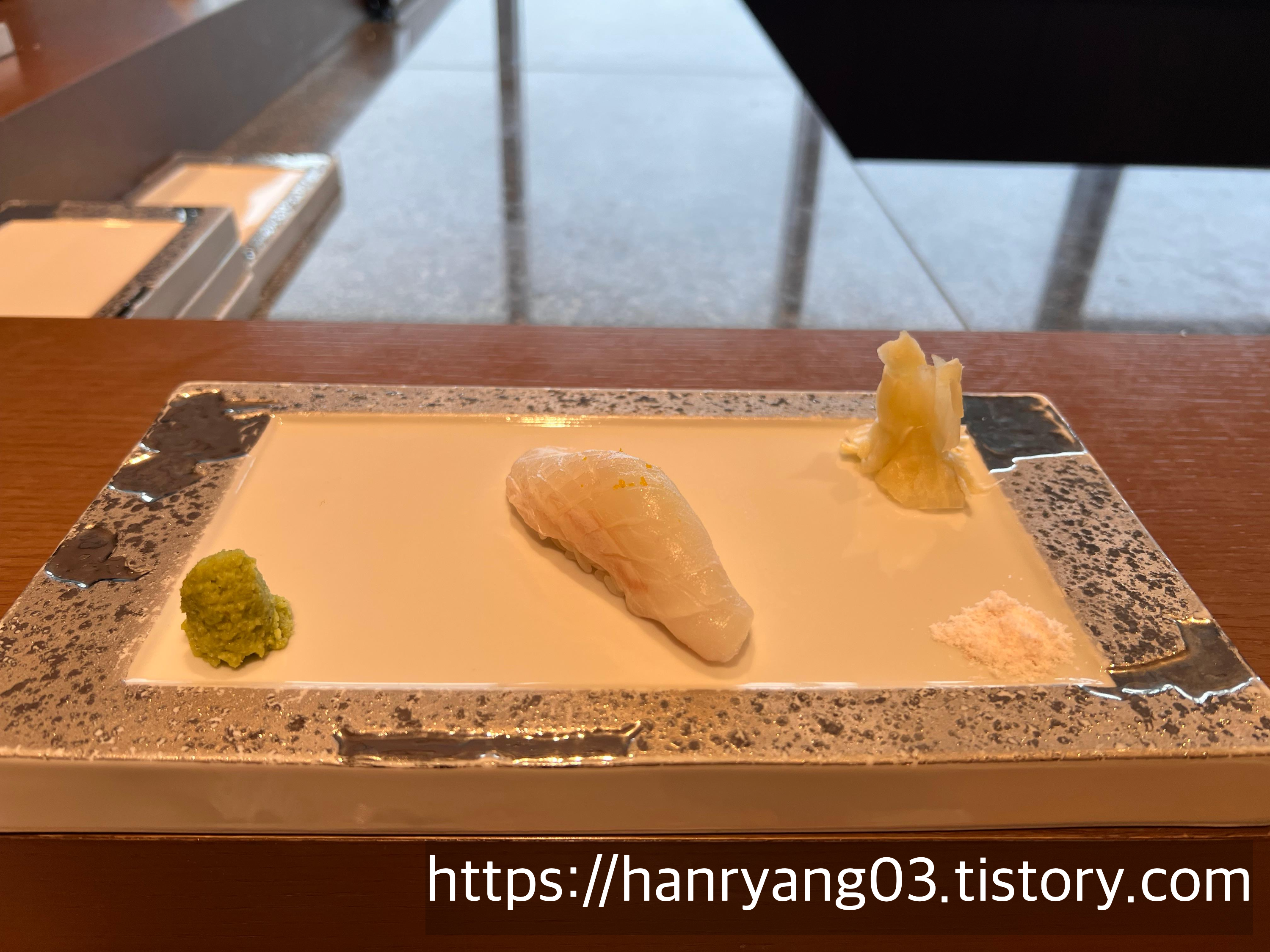 추가적으로 사진 오른쪽에 손수건이 하나 더 늘었는데, 이건 필자처럼 손으로 스시를 먹는 사람들을 위해 제공된 손수건이다. 매 피스를 먹고 나서 손을 닦고 새 피스를 먹으면 된다. 아마 후술할 고등어 봉초밥 때문에 모든 사람들이 손으로 한 피스 이상 먹게 되어서 모든 자리에 다 제공을 해준 것 같다.