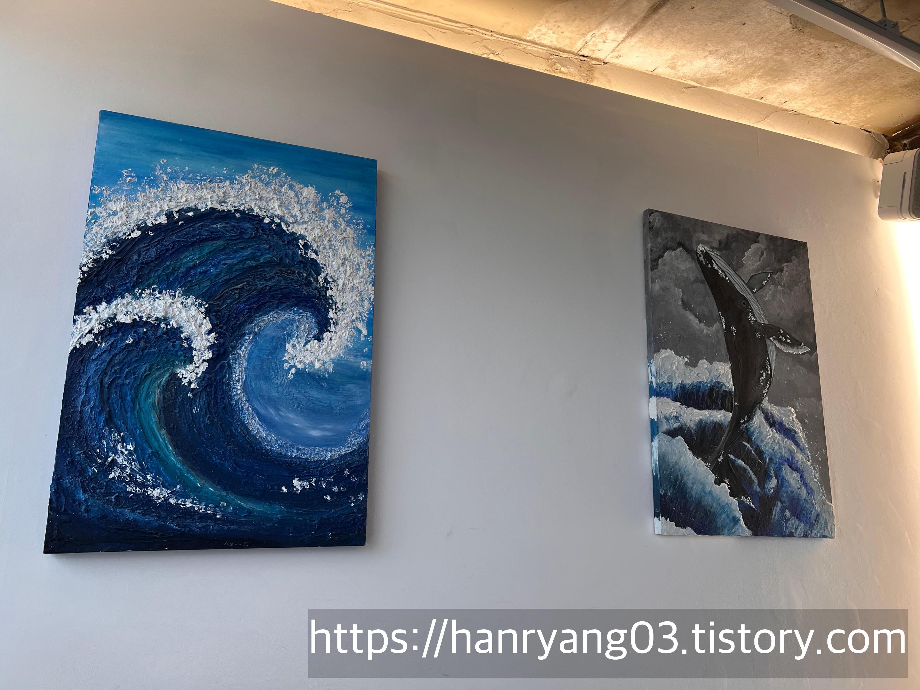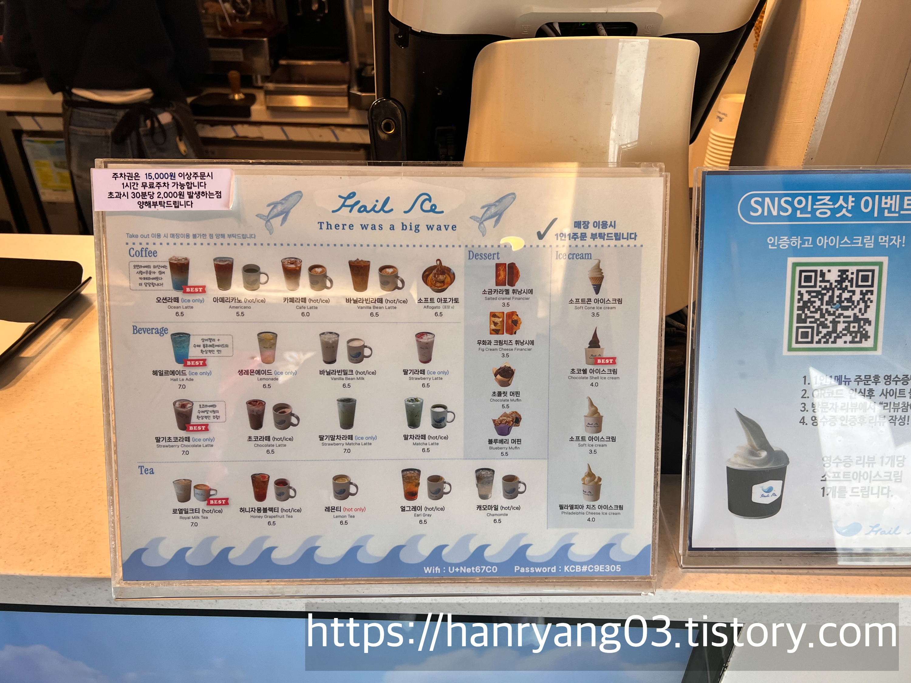 헤일르 에이드와 오션 라떼, 그리고 소금 카라멜 휘낭시에를 시켰다. 오션라떼는 그냥 레몬에이드 맛인데, 거기다가 소다맛 돌고래 젤리를 올려놨고, 오션 라떼는.... 사실 그냥 잘 만들어진 라떼 맛이었다. 휘낭시에는 살짝 퍽퍽하지만 달달한게 맛있었다. 사실 음료는 맛없지만 않으면 상관 없다 생각하고, 뷰 하나로 모든걸 압도하는 곳이라, 인생샷을 건지고 싶으신 독자분들이라면 무조건 오는걸 추천한다.