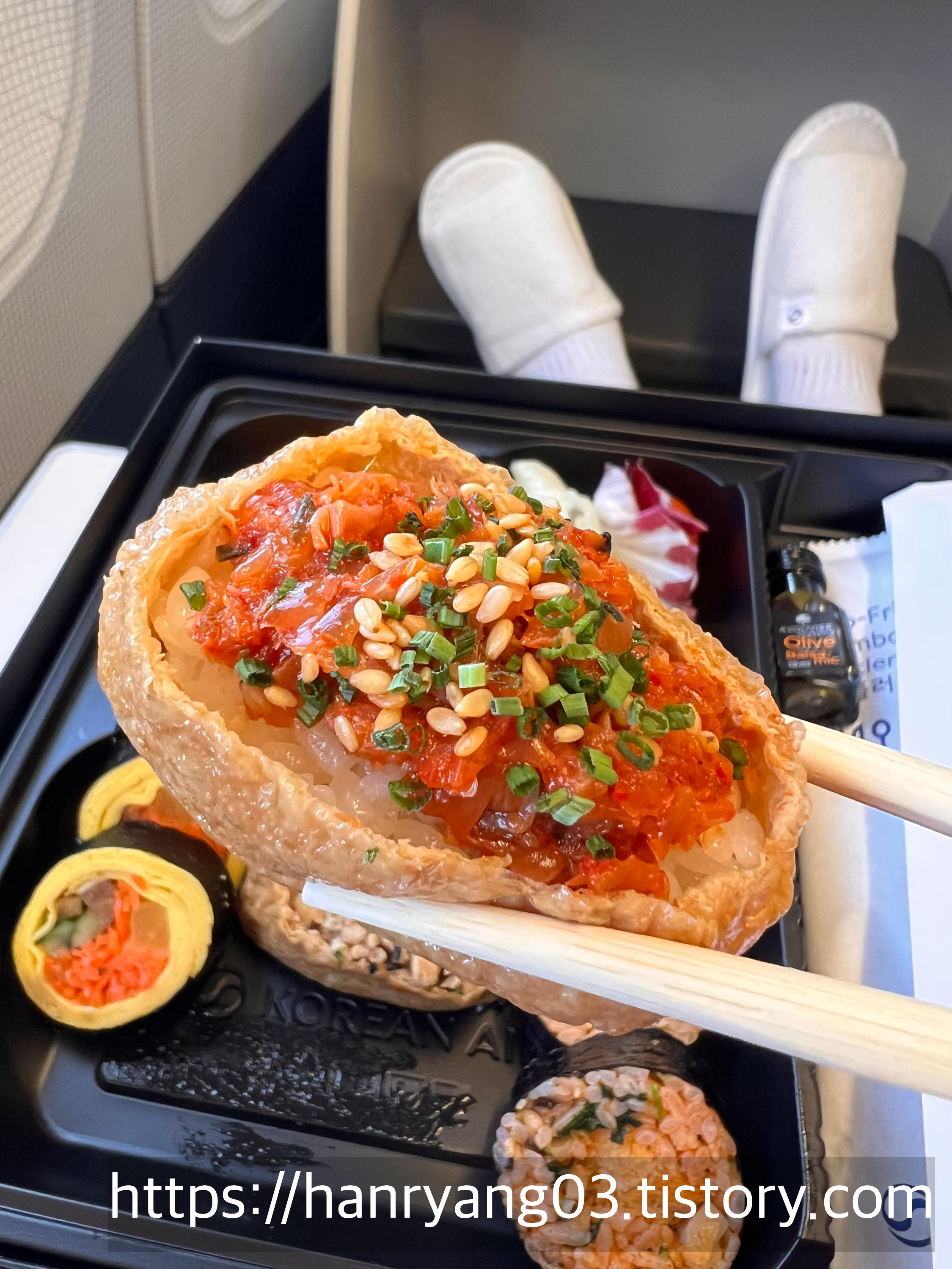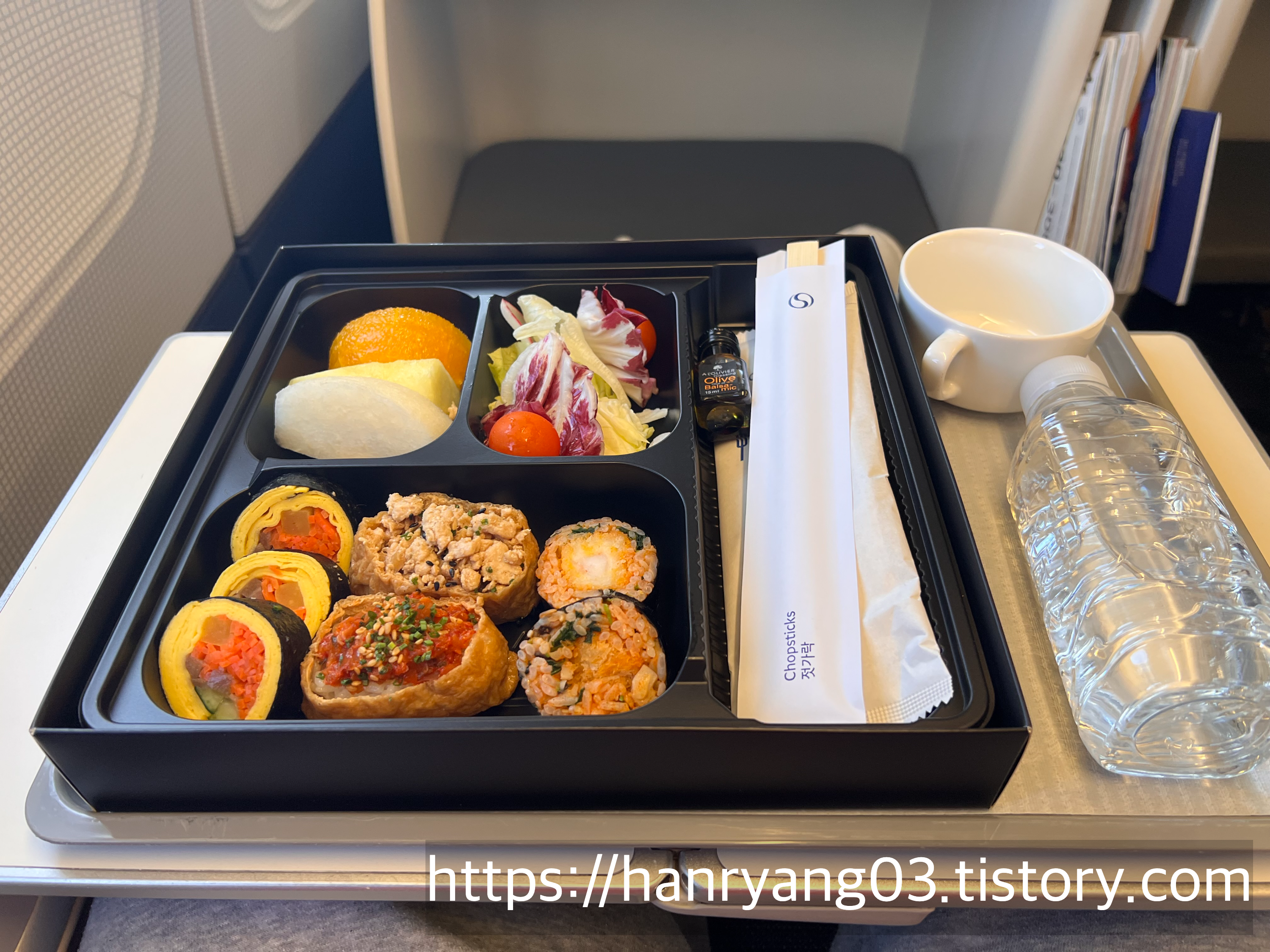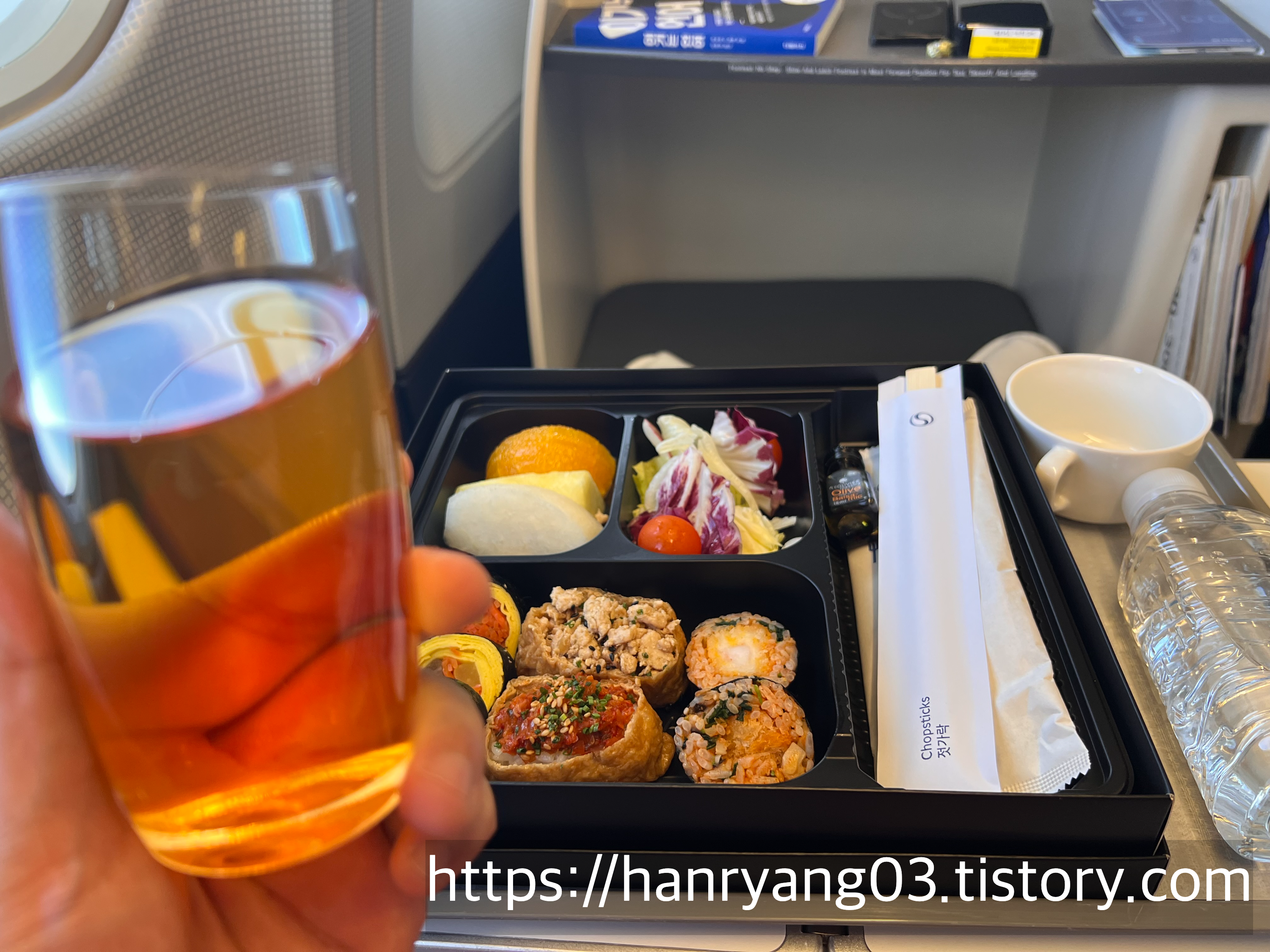술은 아니고 사과주스다. 밥을 먹으려고 젓가락을 들던 와중에 승무원 분이 더 필요한건 없냐고 물어봐줘서 사과주스 한 잔을 더 받았다. 뭐 하나라도 더 챙겨주려는 친절한 서비스가 상당히 마음에 든다.