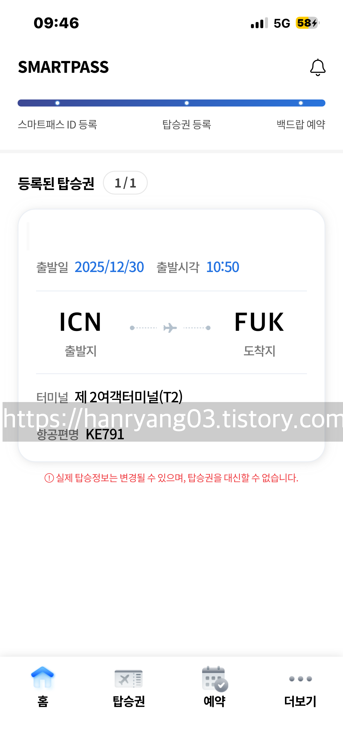 체크인을 하자마자 탑승권이 등록되었다는 카톡 메시지가 오고, 앱을 열어보면 자동으로 등록되어있는 탑승권 정보를 확인할 수 있다. 국내항공사를 이용할 경우 바로 스마트패스 전용줄로 들어가서 출국장으로 입장하면 된다.
