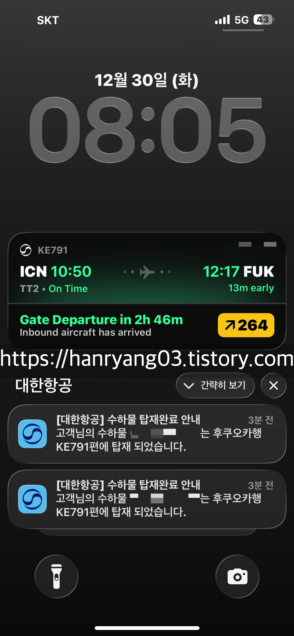 가장 오른쪽 사진은 미리 Flighty 앱에 등록해둔 항공권 정보를 바탕으로 알림을 보내주고 있는 모습이었다. 게이트 정보와 출발 시간을 알려주고 있다.