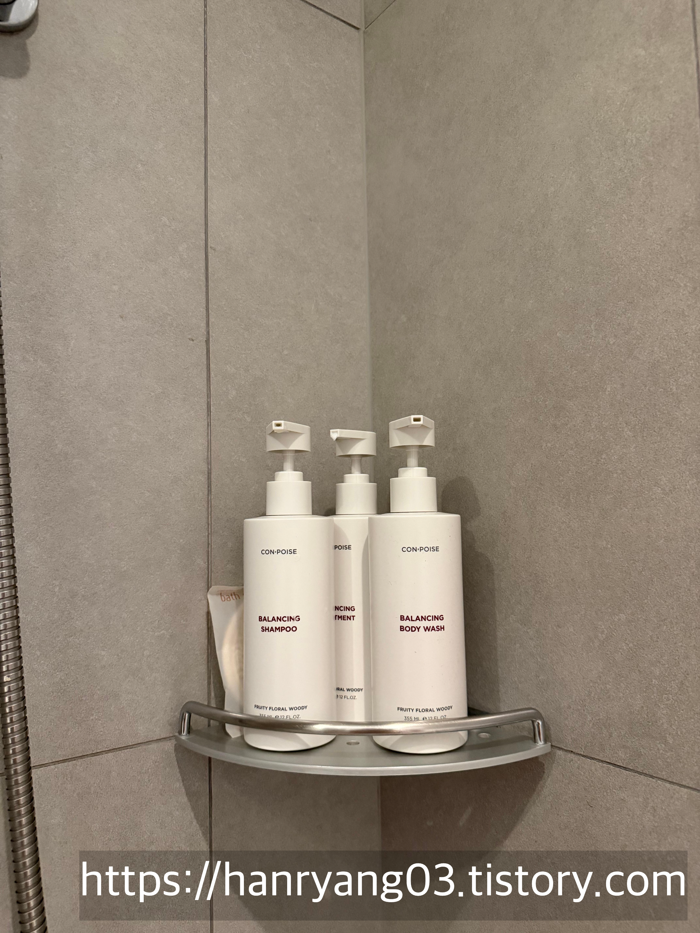 롯데호텔&리조트에서 자체개발한 롯데시티호텔용 브랜드인 컨포이스이다. 향도 괜찮고, 호텔 샴푸 특유의 그 빳빳해지는 머리카락의 느낌이 들지 않아서 상당히 만족스러웠다. 방문 후 따로 찾아보니 별도로 판매하고 있다고 하니, 사용하고 만족스러웠던 독자분들은 구매해보시는 것도 좋을 것 같다.