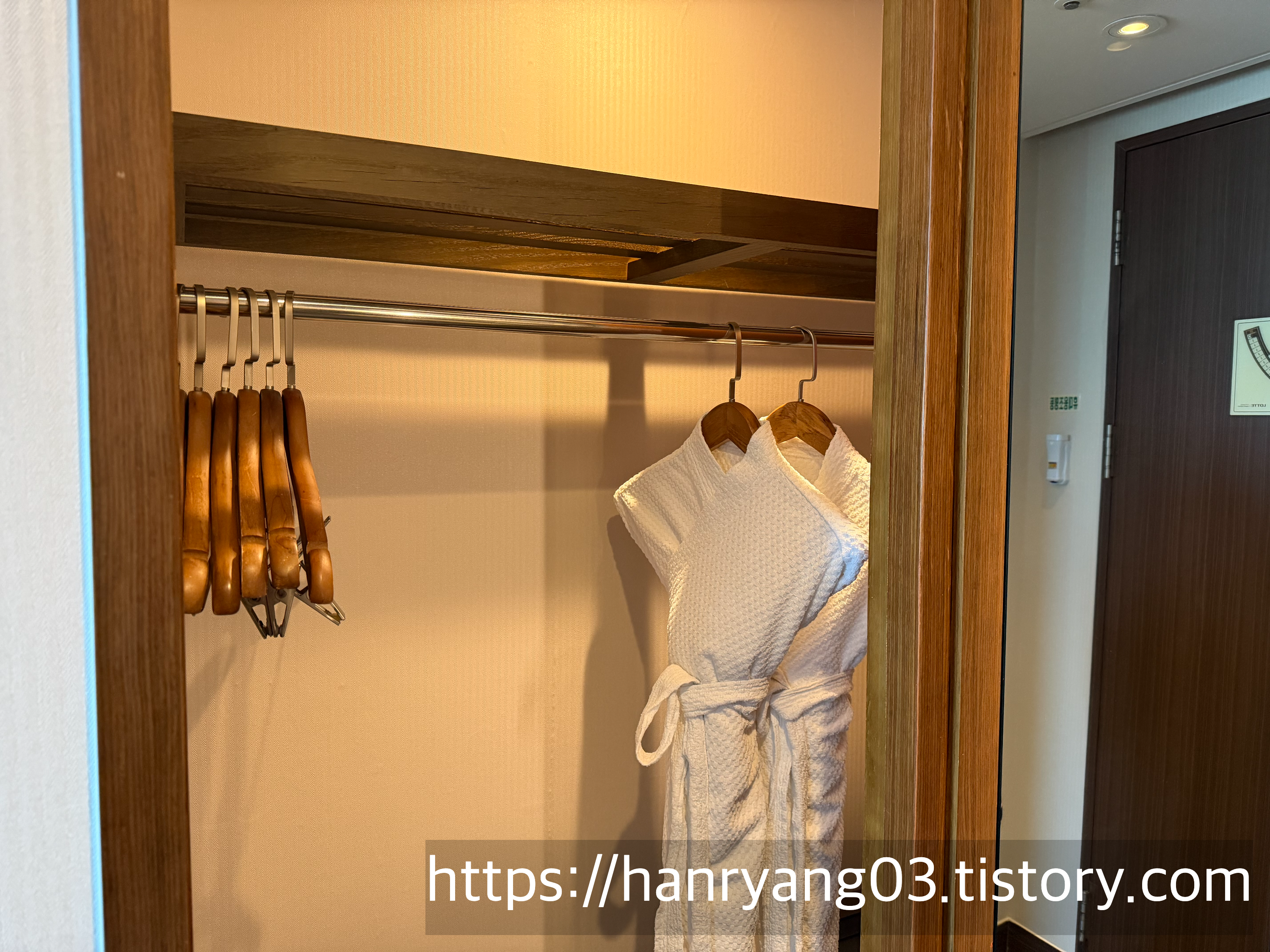 상의를 걸 수 있는 옷걸이 3개와 하의 집게까지 있는 옷걸이 3개, 그리고 샤워가운 두 벌을 제공해준다.
